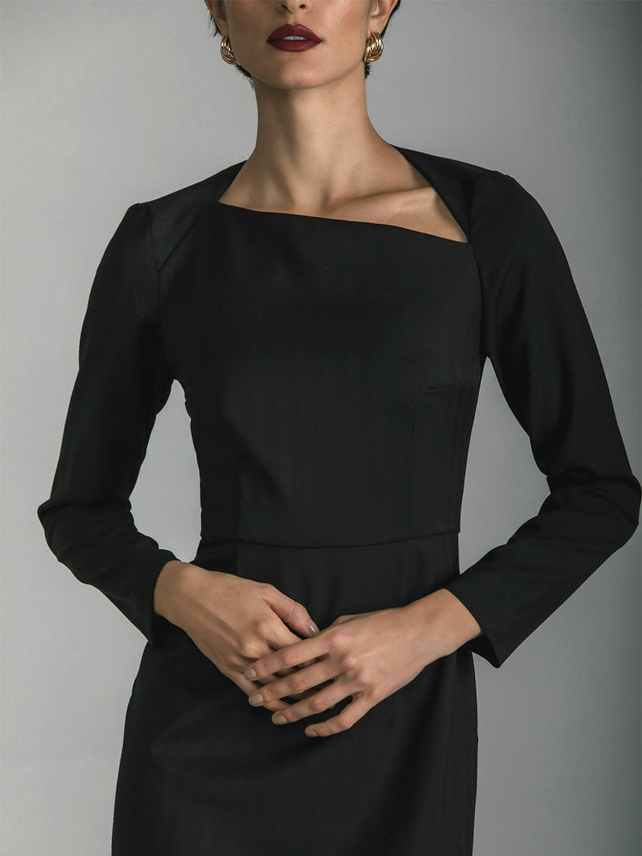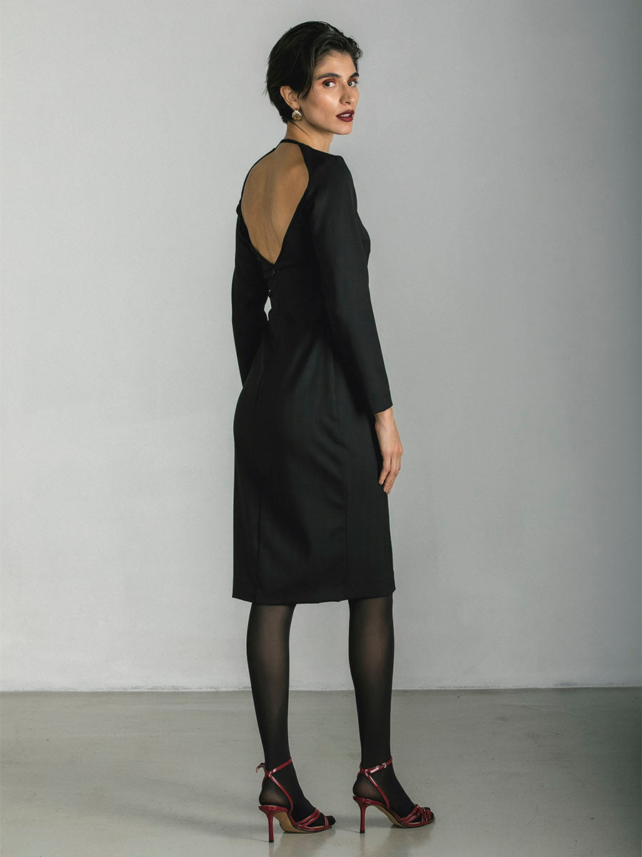 Abito midi con profonda scollatura sulla schiena, pensato per esaltare la silhouette con eleganza e femminilità. Il design avvolgente è bilanciato dalla manica lunga, che dona equilibrio e raffinatezza. Versatile e sofisticato, l’abito Audrey è ideale per cene, cerimonie o serate speciali, abbinato a tacchi alti e accessori statement per un look elegante e d’impatto. Può essere indossato anche di giorno con un blazer o un cappotto, per un outfit professionale e sempre raffinato.
